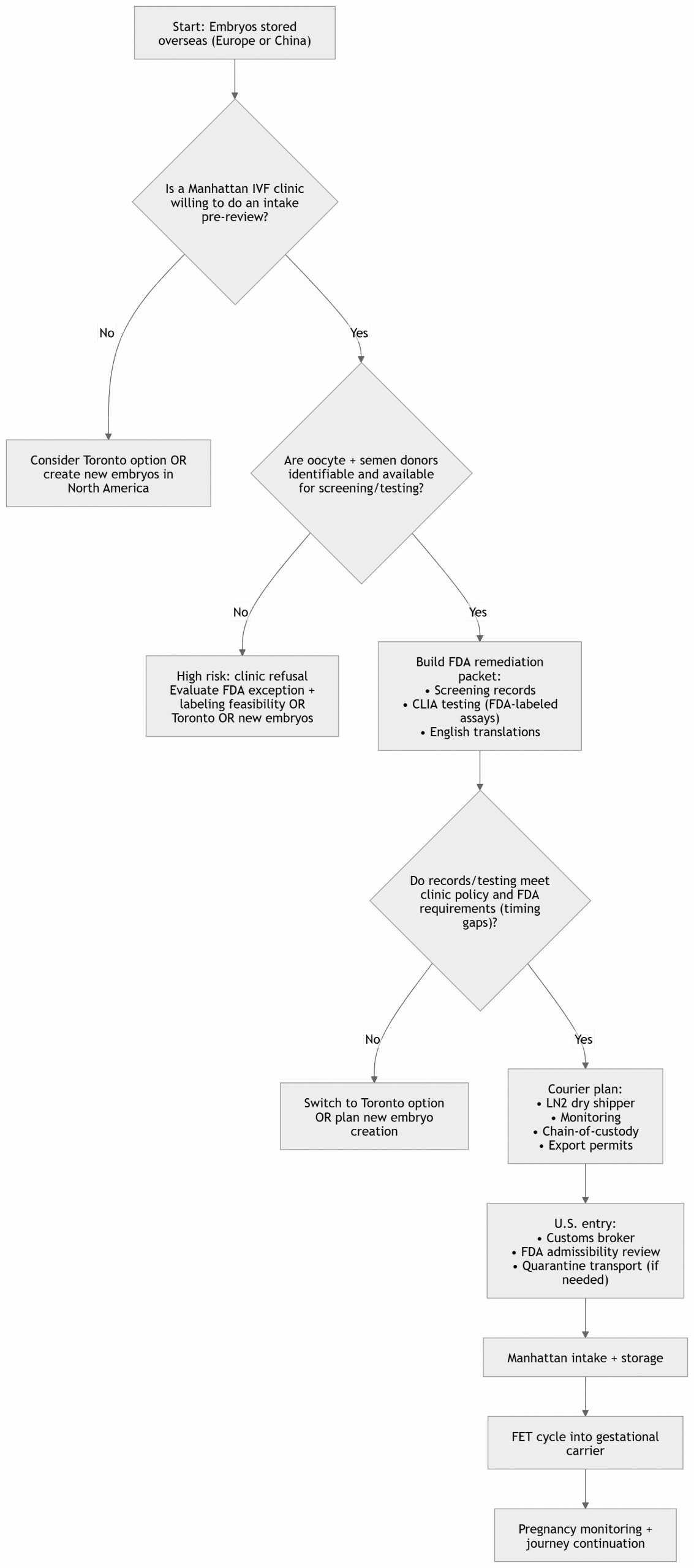 Start with a Manhattan receiving clinic pre‑review and a written list of required documents/testing. This aligns your entire plan with the reality that FDA requires donor eligibility for embryo transfer (with limited exceptions) and that import entry may require HCT/P establishment registration number and compliance affirmations.
